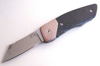 This small handmade assisted opener is powered only after the blade is squeezed back towards the handle. It has a bias toward closure until the blade is moved. Dao shaped blade with Hamon (Japanese clay temper line). Honeycomb composite handle scales with copper electroconductive mokome bolsters.
